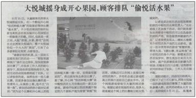线下版悦活种植大赛活动,秉承了娱乐互动的推广精神,在活动内容设置、活动环节、活动过程等当中都与开心网游戏巧妙对应,真实再现了开心网上的场景和乐趣,再次引发了媒体的积极报道——《大悦城摇身成开心果园,顾客排队“偷悦活水果”》、《漫生活PK快节奏,两万人街头为理想生活投票》、《中粮悦活“开心”秀》、《西单大悦城将上演网络种植大赛偷果榨汁真人秀?》、《开心果园偷果子 Linda主持游戏两不误》等,把“悦活果蔬汁”上市话题炒作推向顶峰。