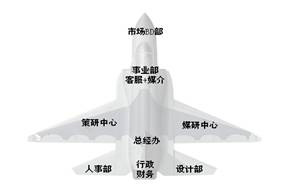 如果从公司外部去看整个公司的组织结构的话,整体图形像一架飞机——市场部是衔接公司产品和社会需求的枢纽,其四通八达还是独行小道将决定公司的发展速度;而事业部则类似于企业的生产车间,生产流程的科学与否将决定产品的质量好坏;策研中心和媒研中心是公司的核心技术资源,如同轰炸市场的重量级兵器弹药;人事、行政、设计等部门等都可以简单归结为服务部门,主要功能是给一线人员提供粮草补给等作用;而总经办等高管人员,也是处于支持部门的定位,在业务开拓和服务过程中,需要建立高层关系的时候,随叫随到,整体形成一个强有力的无坚不摧拳头。